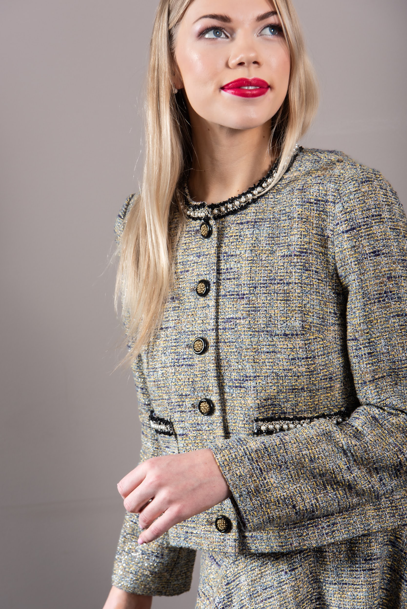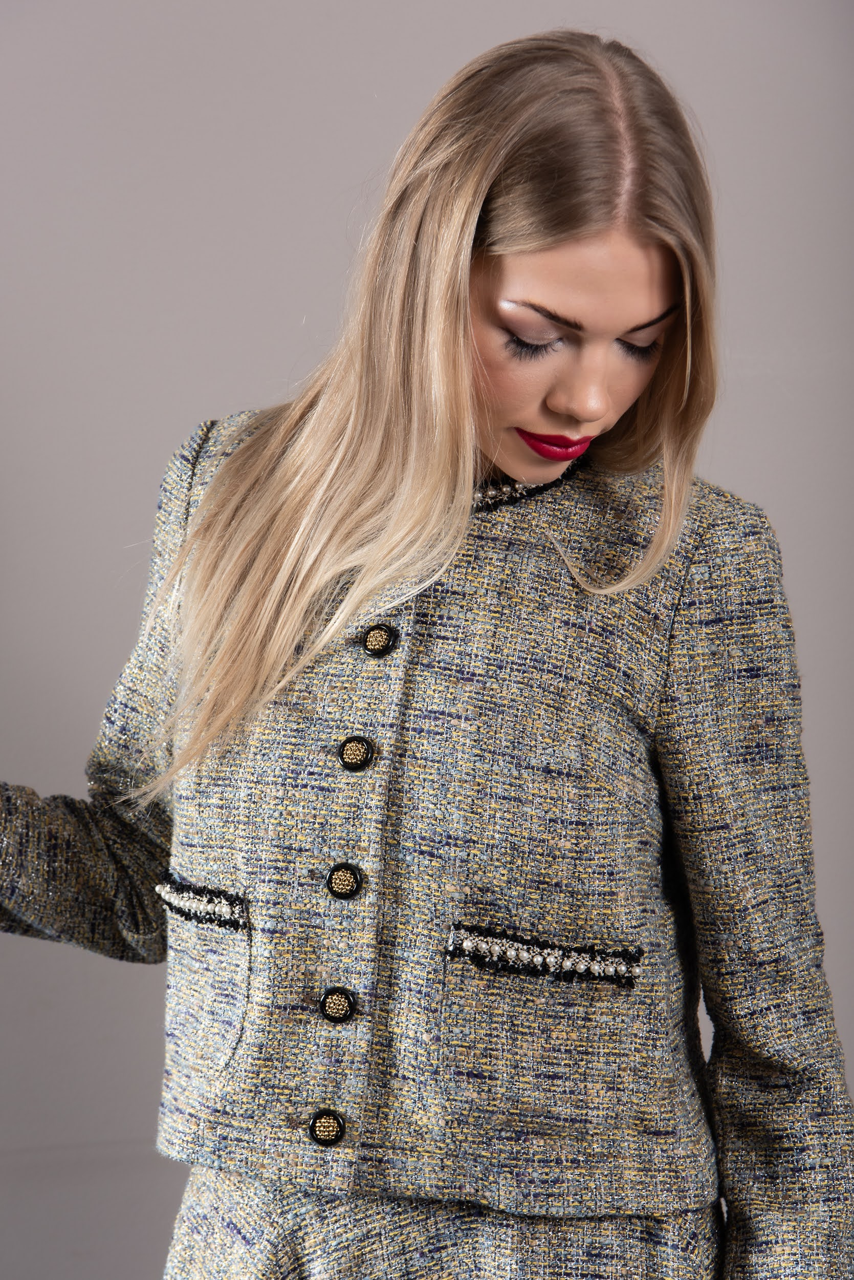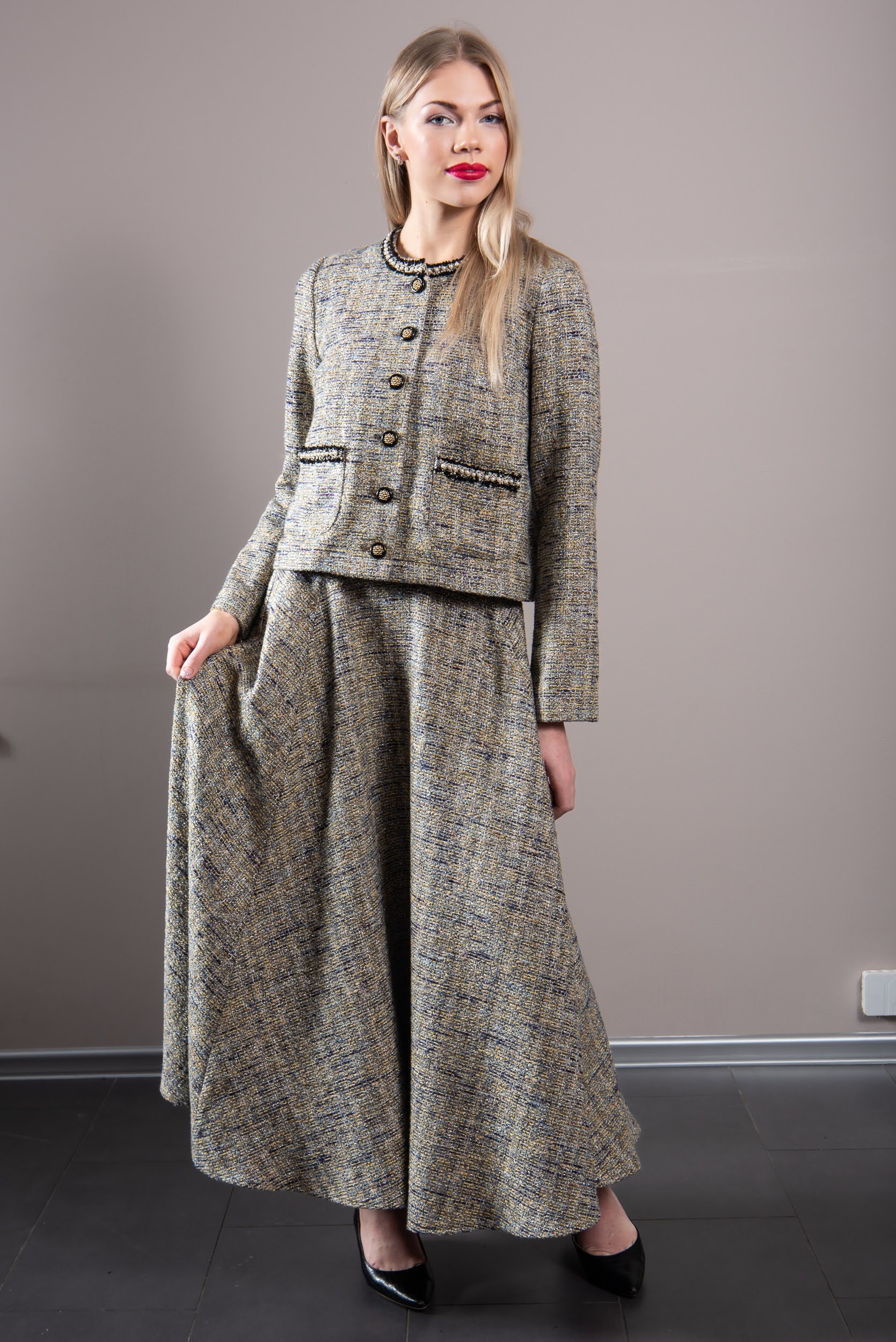 REVAL-stiilis kleite tõime esimest korda välja 2020 kevadkollektsioonis, seal oli 4 erinevat mudelit, sealhulgas keskelt läbilõikega laia seelikuga mudel ning 4 esitaskuga mudel. Vt linki siin. Kokku oleme 6 aasta jooksul teinud Reval-kleite seitsmest erinevast tviidkangast. Nüüd siis populaarne GALA mudel, mil on pikk klošš-seelik.