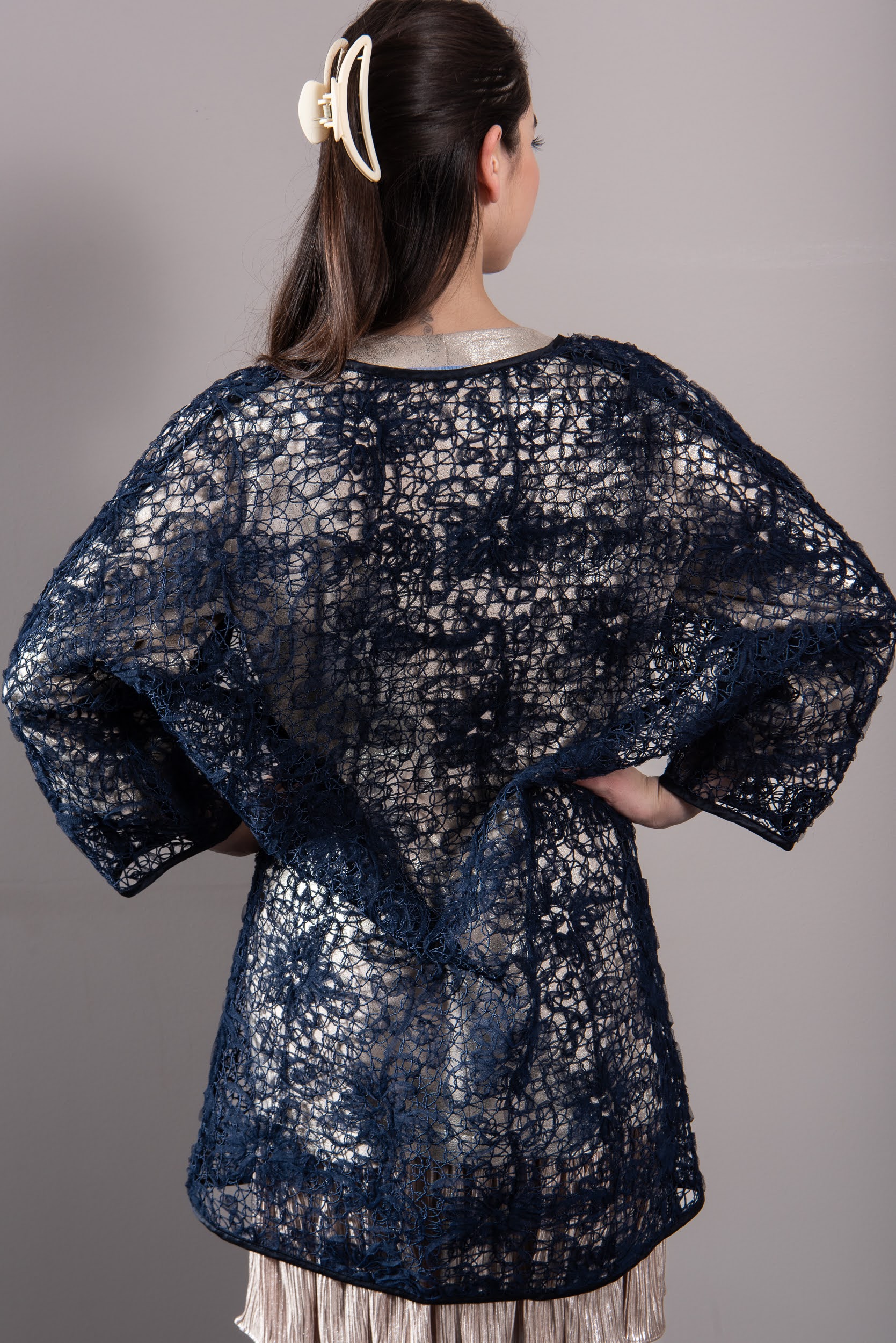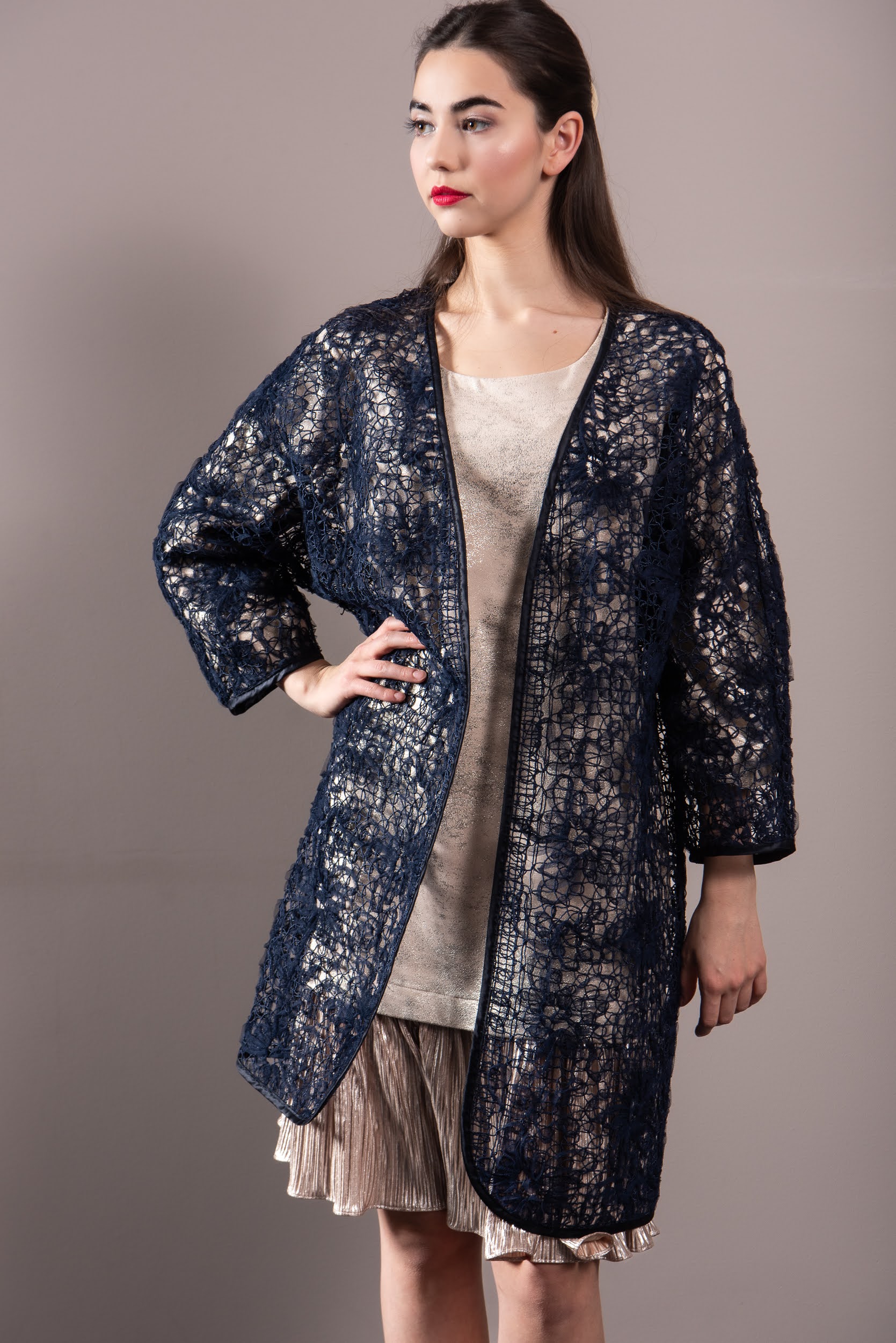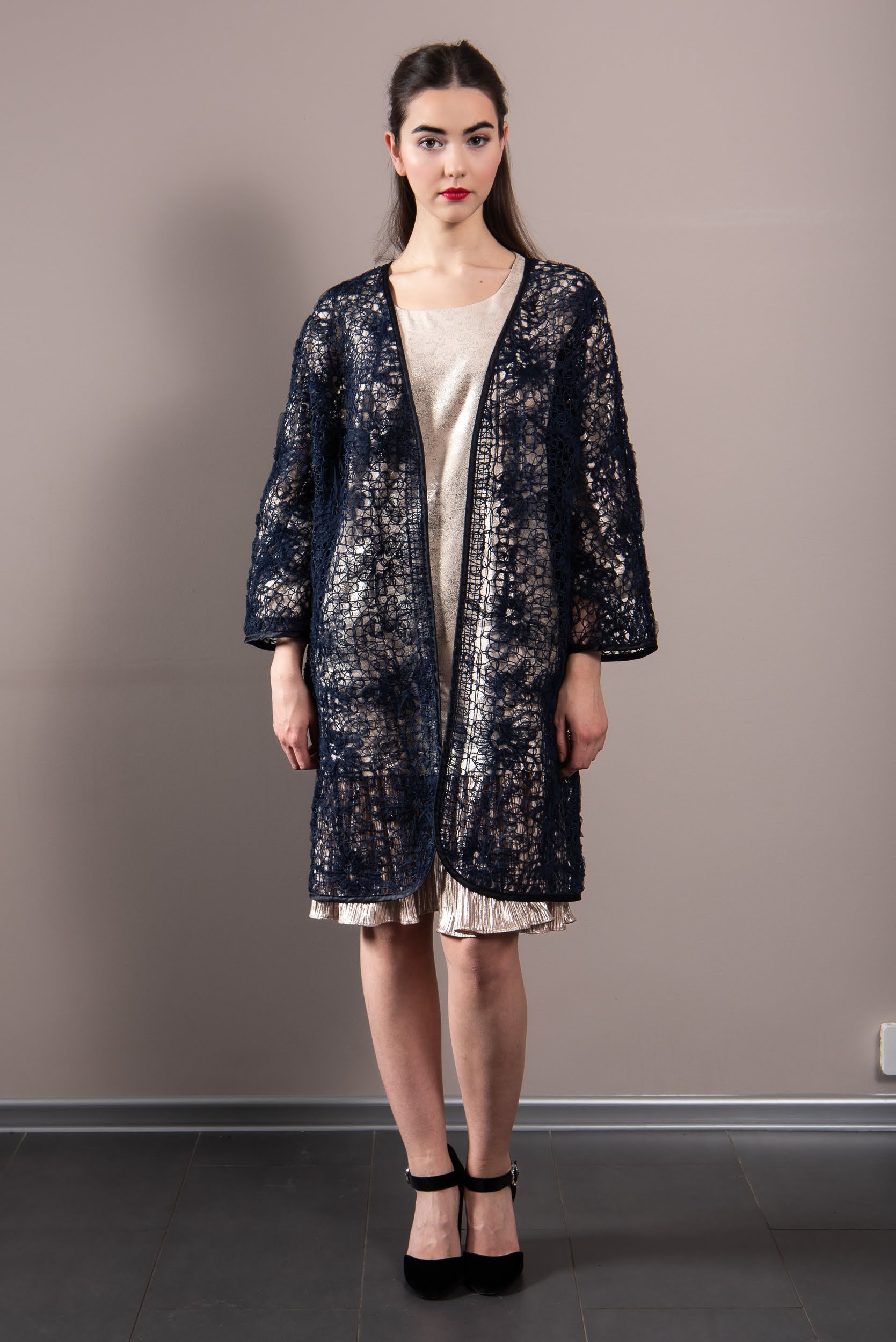 Uus kimonojakk on 3D tumesinisest pitsist, mahuline ja efektne. Kangas on väga eriline ja huvitav, sobib pidulikuks puhuks ja muidu ka pilgupüüdjaks. Kimono hõlmad käivad vaheliti, lisana saab hinna sees tellida sinist seotavat sametvööd. Varrukad on poolpikad. Jakki saab kanda nii päevasel kui õhtusel üritusel, nii pükste kui seeliku või ka kleidi peal, nii hõlmad lahti kui kinniseotuna. Kimonojaki üldpikkus taga keskel on 92 cm. Tellides saab muuta kimono pikkust. Kohe olemas suurus 36/40 nagu modellil seljas