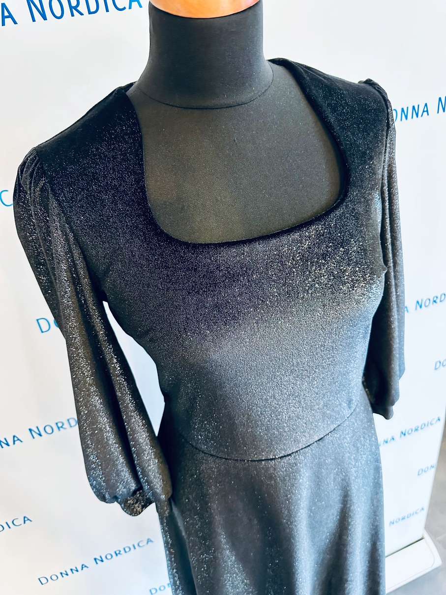 Klassikaline väike must kleit. See hõbedase sädelusega must sametkleit on keskelt läbilõikega, 3/4 mansetiga varrukatega ja dekoratiivse kaelaauguga. Kleidi seeliku pikkus on 58 cm. Materjal on 95% polüester 5% elastaan – pehme, libe, hingav ja mittekortsuv õhemat sorti samet-trikotaaž.