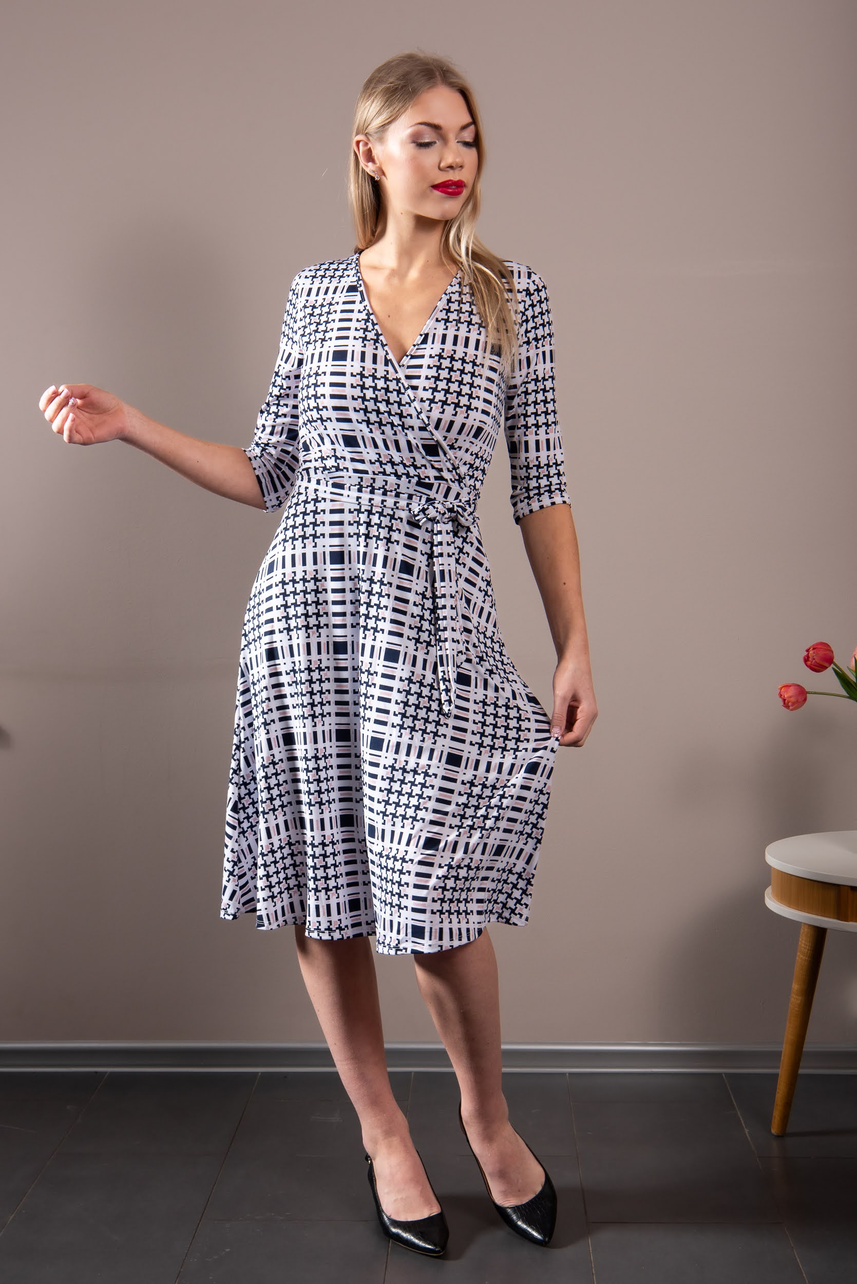 Materjal 100% polüester, pehme ja hingav, mittekortsuv, valmistatud spordikanga tehnoloogiaga. Kleiti saab pesta jaheda veega (30 kraadi) ja masinas, see ei vaja triikimist. Aga kui on vaja triikida, siis läbi märja puuvillase lapi või siis pahemalt poolt ja jahedama rauaga. Mitte valgendada ega kuivatis kuivatada.