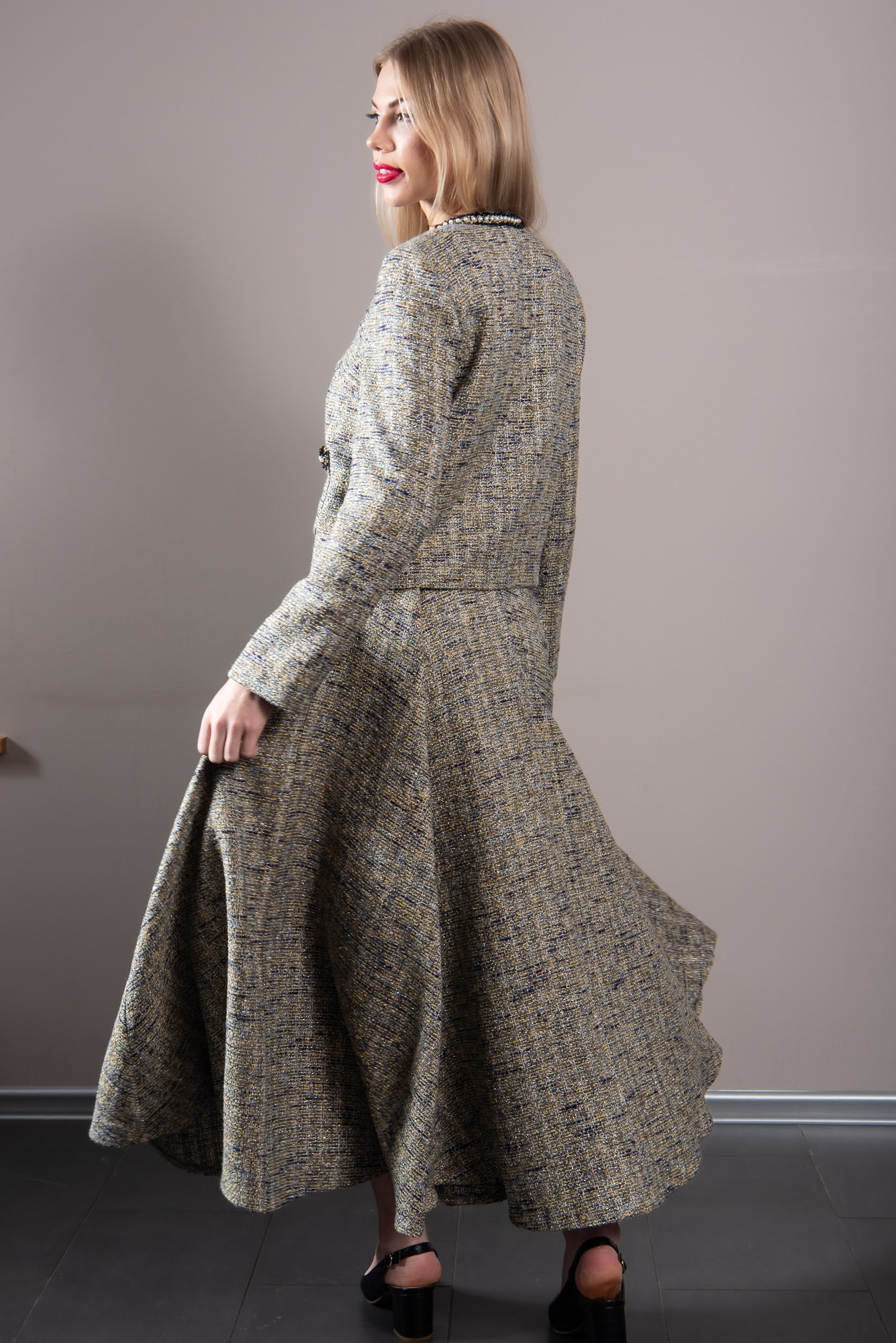 REVAL-stiilis kleite tõime esimest korda välja 2020 kevadkollektsioonis, seal oli 4 erinevat mudelit, sealhulgas keskelt läbilõikega laia seelikuga mudel ning 4 esitaskuga mudel. Vt linki siin. Kokku oleme 6 aasta jooksul teinud Reval-kleite seitsmest erinevast tviidkangast. Nüüd siis populaarne GALA mudel, mil on pikk klošš-seelik.
