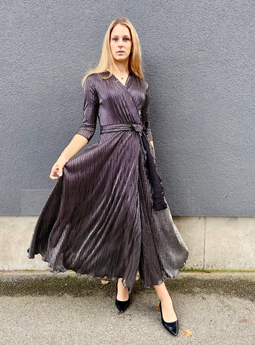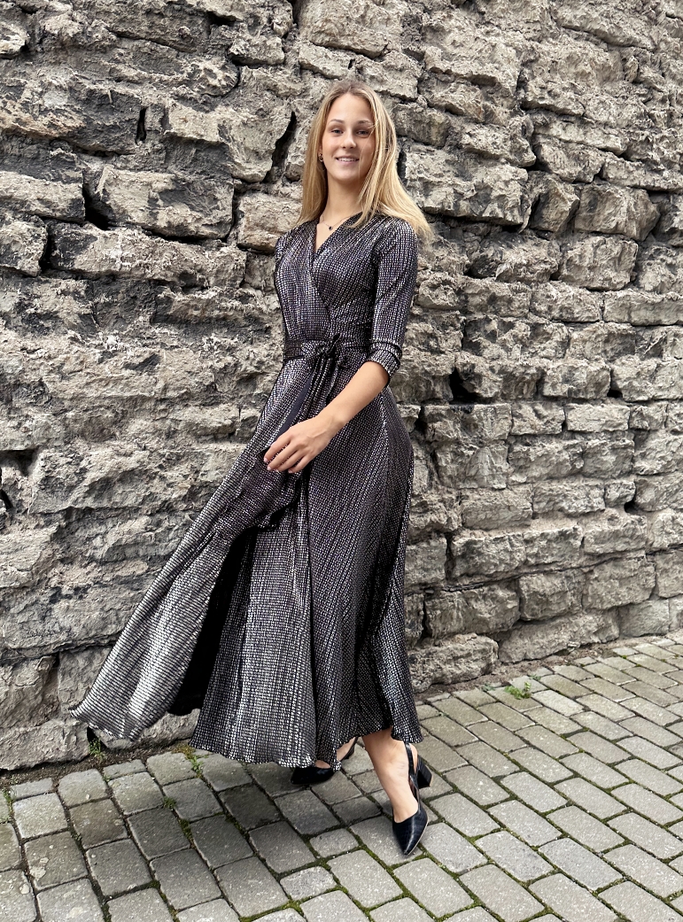 See peenplissee polüestertrikotaažkangas sisaldab elastaani, mis annab kangale pehmuse, hea langevuse ning vastupidavuse. Kangas on tehtud moodsa tehnoloogiaga nagu spordikangas, see hingab, reguleerib temperatuuri ning ei aja higistama. Sellest kangast kleit on ideaalne reisikleit, on kerge, ei kortsu, saab kohe kohvrist selga panna. Kleiti saab pesta masinas õrnal režiimil ja jaheda veega. Vt hooldusjuhendit kleidi seelikuosa küljeõmbluses.