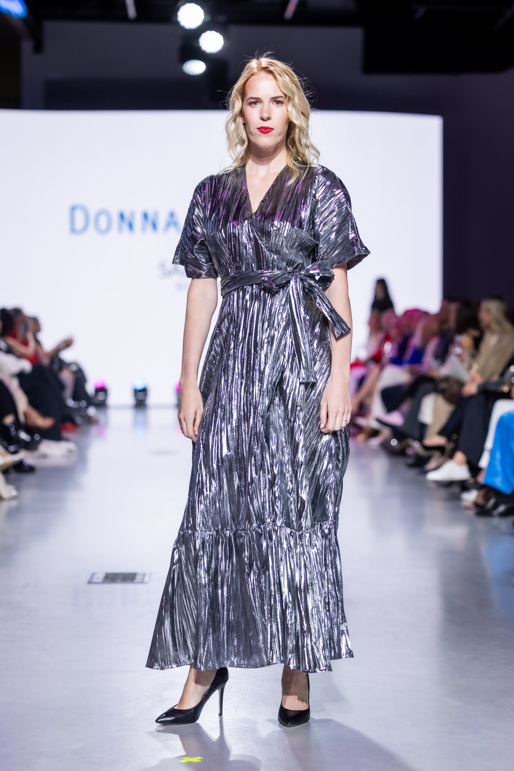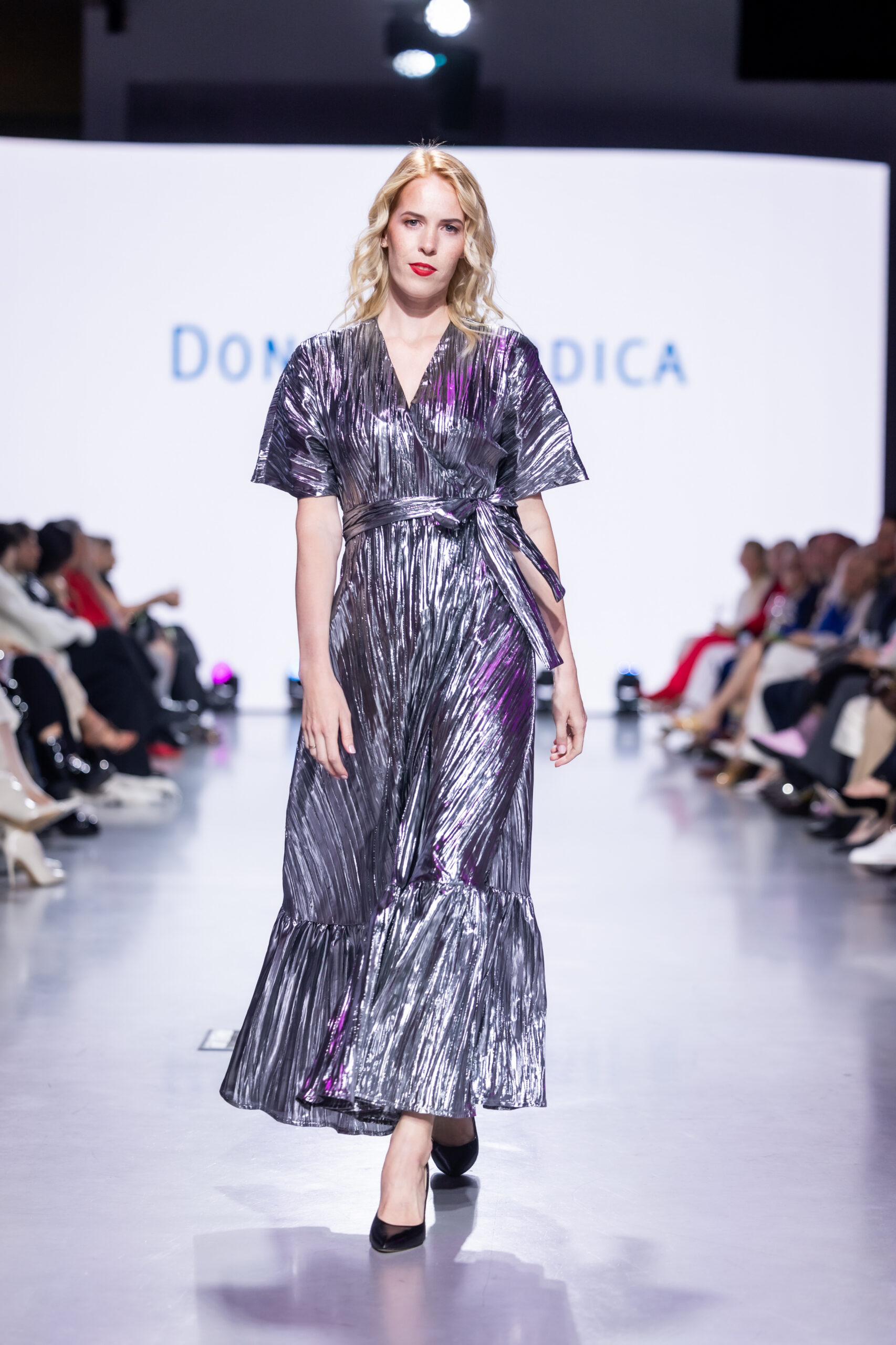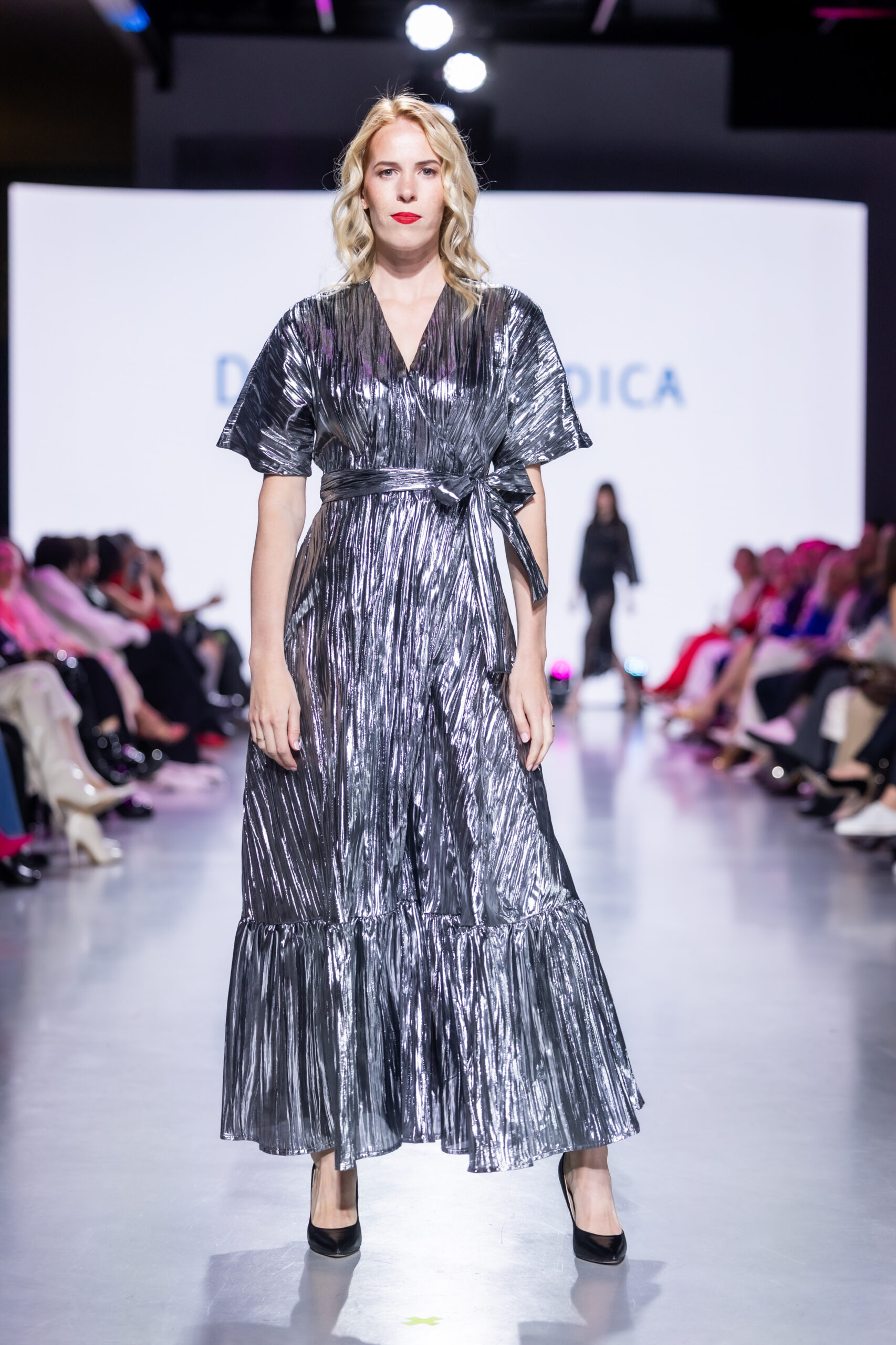 See hõbedase metallikläikega grafiidivärvi kortsutatud lameekangas sisaldab lisaks polüestrile lamedaks valtsitud metallikkiudu, mis annab kangale efektse sära ja läike. Vt hooldusjuhendit kleidi seelikuosa küljeõmbluses. Kleiti võib pesta käsipesus külmas vees, triikimine pole lubatud.