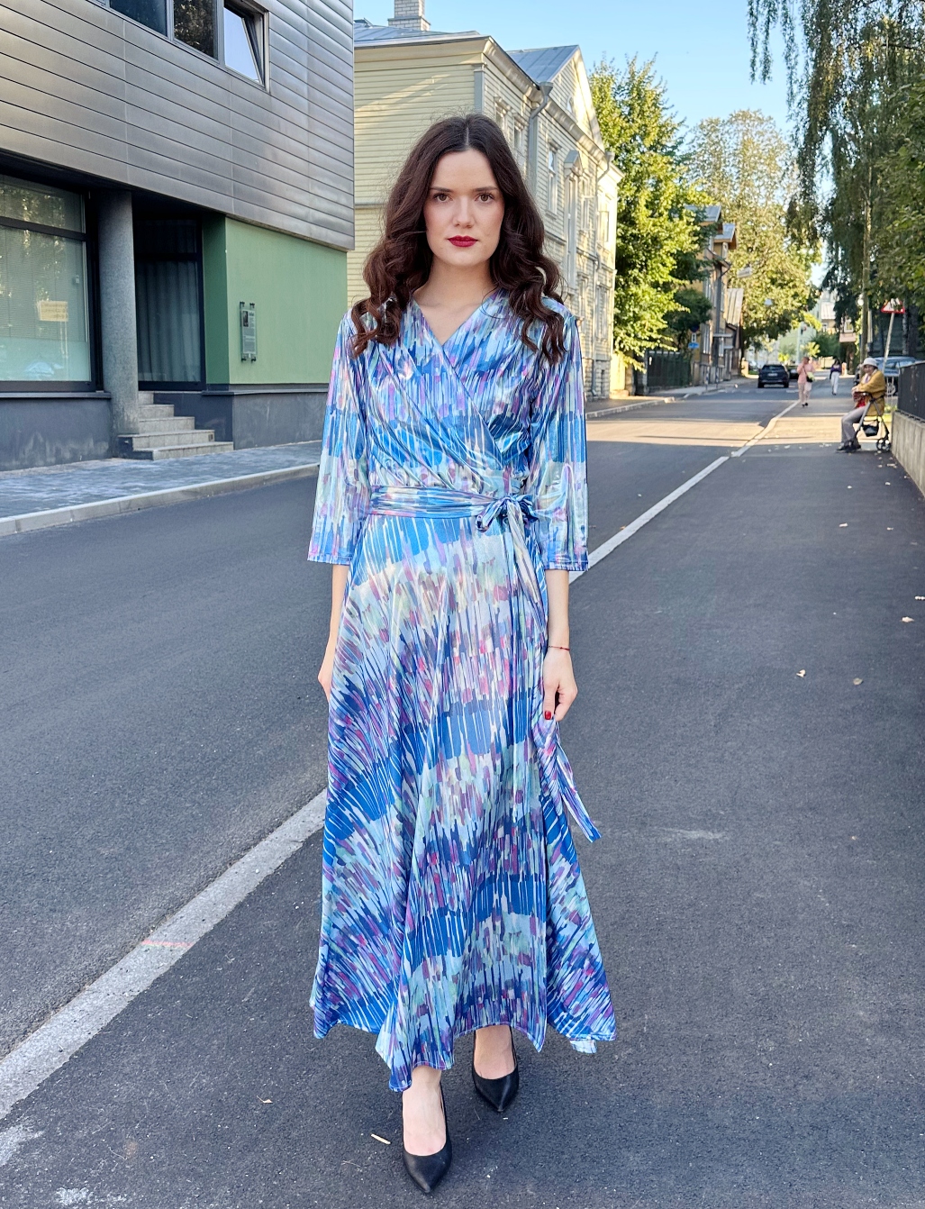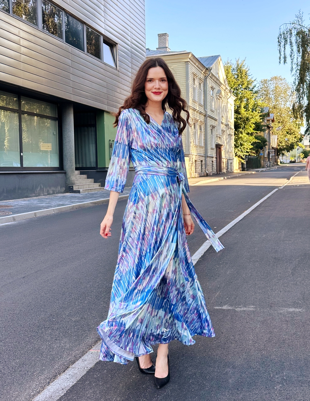 Allikavee sillerdusena läikiv sinistes toonides pidulik pikk hõlmikkleit on sirgete 3/4 varrukatega.Seeliku pikkus s 42 (kohe olemas) on 98 cm. Tellides suurust, mida pole kohe olemas, saab seeliku pikkust ning varruka kuju muuta. Materjal on 95% polüester 5% elastaaniga. Kangas hea langevusega ning pehme satiintrikotaaž.