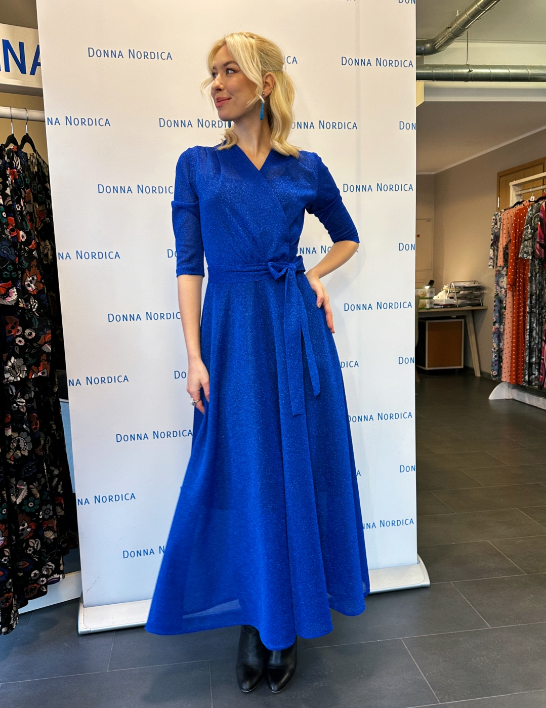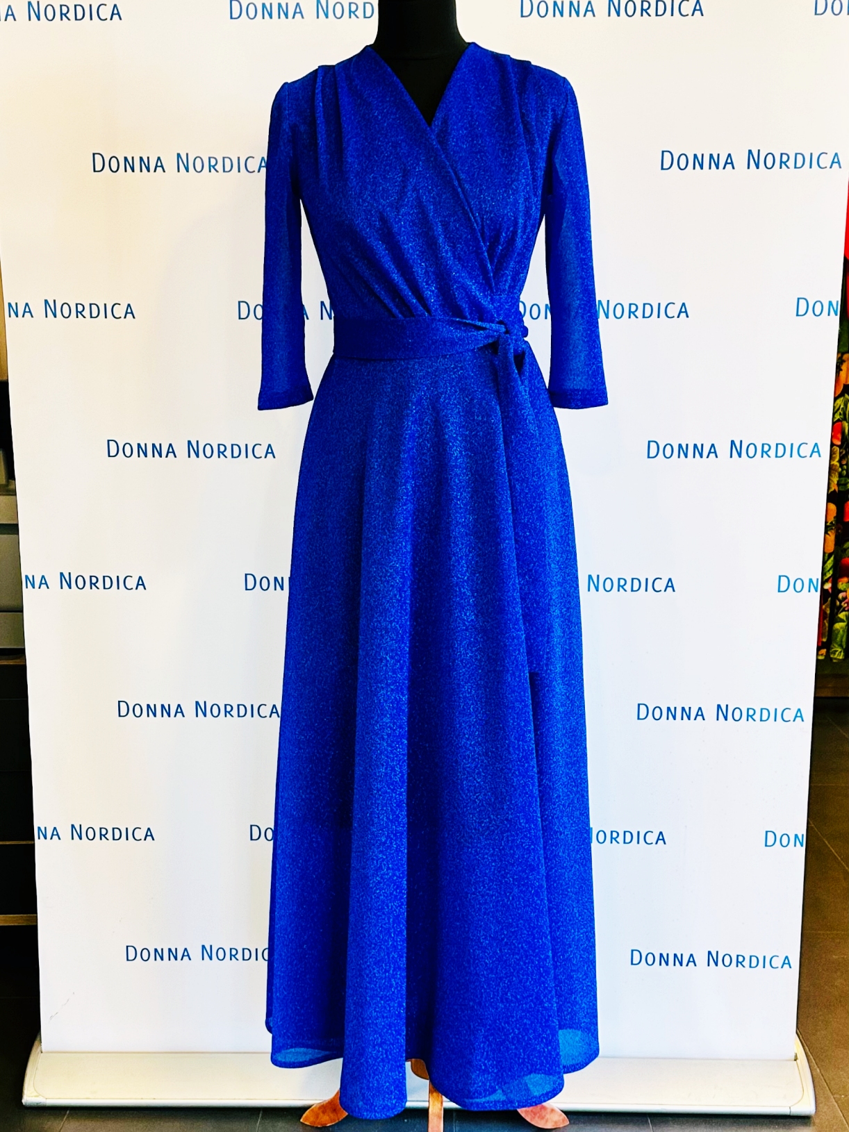 Sädelev safiirsinine organzakangast pikk hõlmikkleit on 3/4 varrukatega. seelikul on poolvooder. Kohe olemas suurus 38. Tellides suurust, mida pole kohe olemas, saab seeliku pikkust ja varruka pikkust ja kuju muuta. Materjal on 95% polüester 5% elastaaniga. Kangas hea langevusega kuid samas pehme ja läbikumav organza trikotaaž.