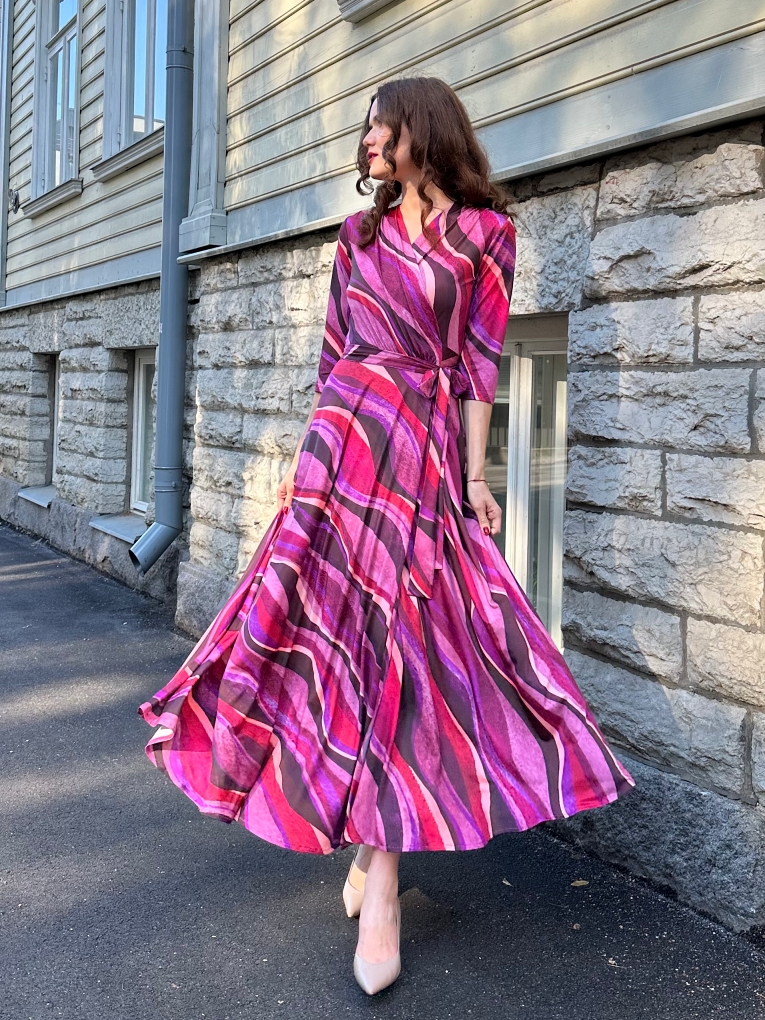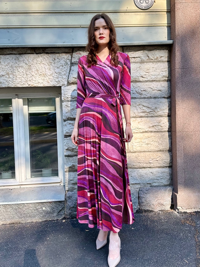 Lillakates virmaliste toonides lookleva dekoormustriga uus pikk hõlmikkleit on lõikelt klassikaline, 3/4 sirge varrukaga. Kleit sobib nii puhkuse-, töö- kui ka pidusündmusesse. See on hea reisikleit, mittekortsuv ning ajatu mustriga. Materjal on 96% polüester ning 4% elastaan, kangas on siidine, pehme, hingav ja mittekortsuv trikotaaž. Mannil seljas suurus 38.