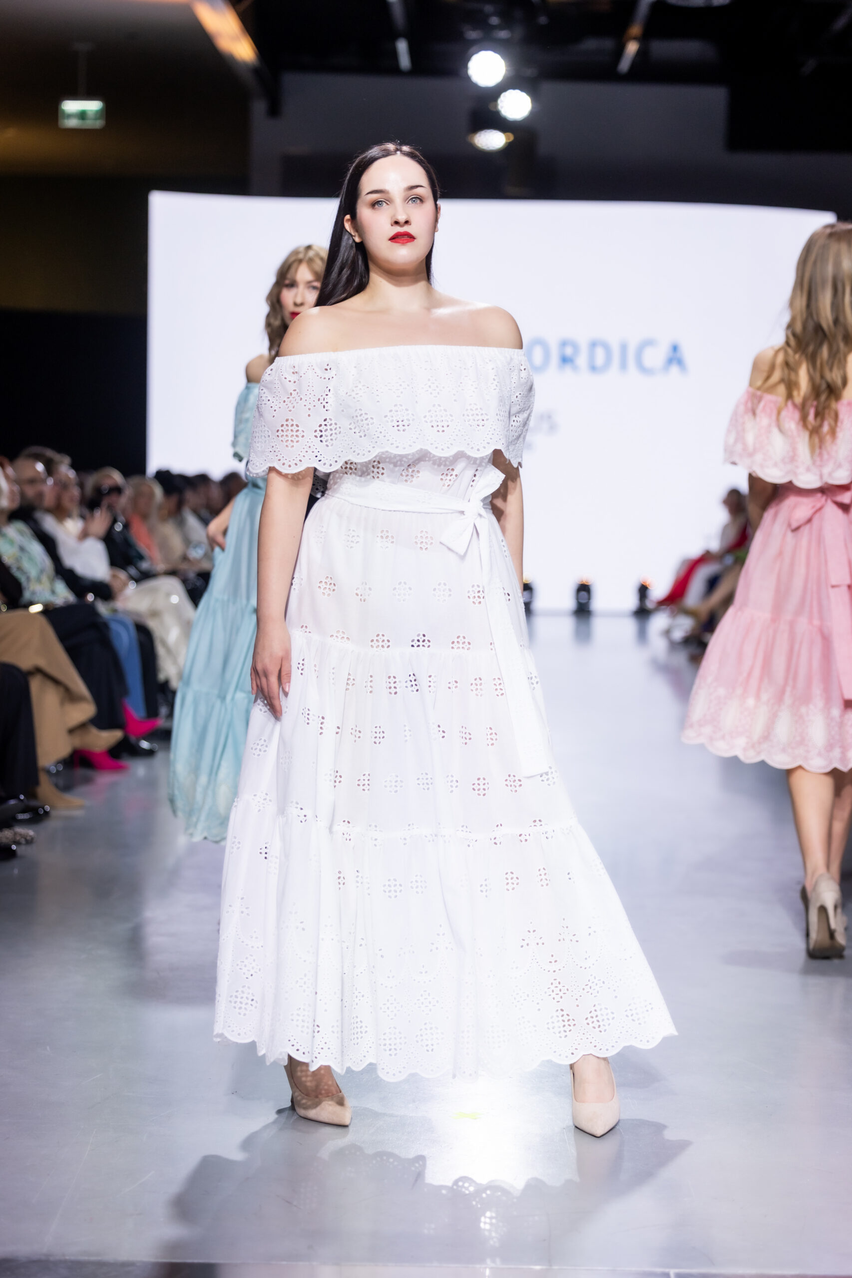 Klassikaline suvine puuvillane valge broderiikleit on maksipikkuses, ilma varrukateta, kuid õlalt maha lükatava volangiga. Kleidi seelikuosas on 2 satsvolangi, all pitsiäär. Seelikuosas on peidetud külgtaskud. Kleidi üldpikkus taga kaelusevolangist alla on 131 cm (s. 36). Lisana seotav vöö, kuid kleiti saab kanda ka ilma vööta. Kleiti on saada ja võib tellida vöökohalt kummiga (s. 38, seelik 102 cm) või sirge trapetsina. Kleit on ilma voodrita. Tellida saab ka lühemat kleiti.