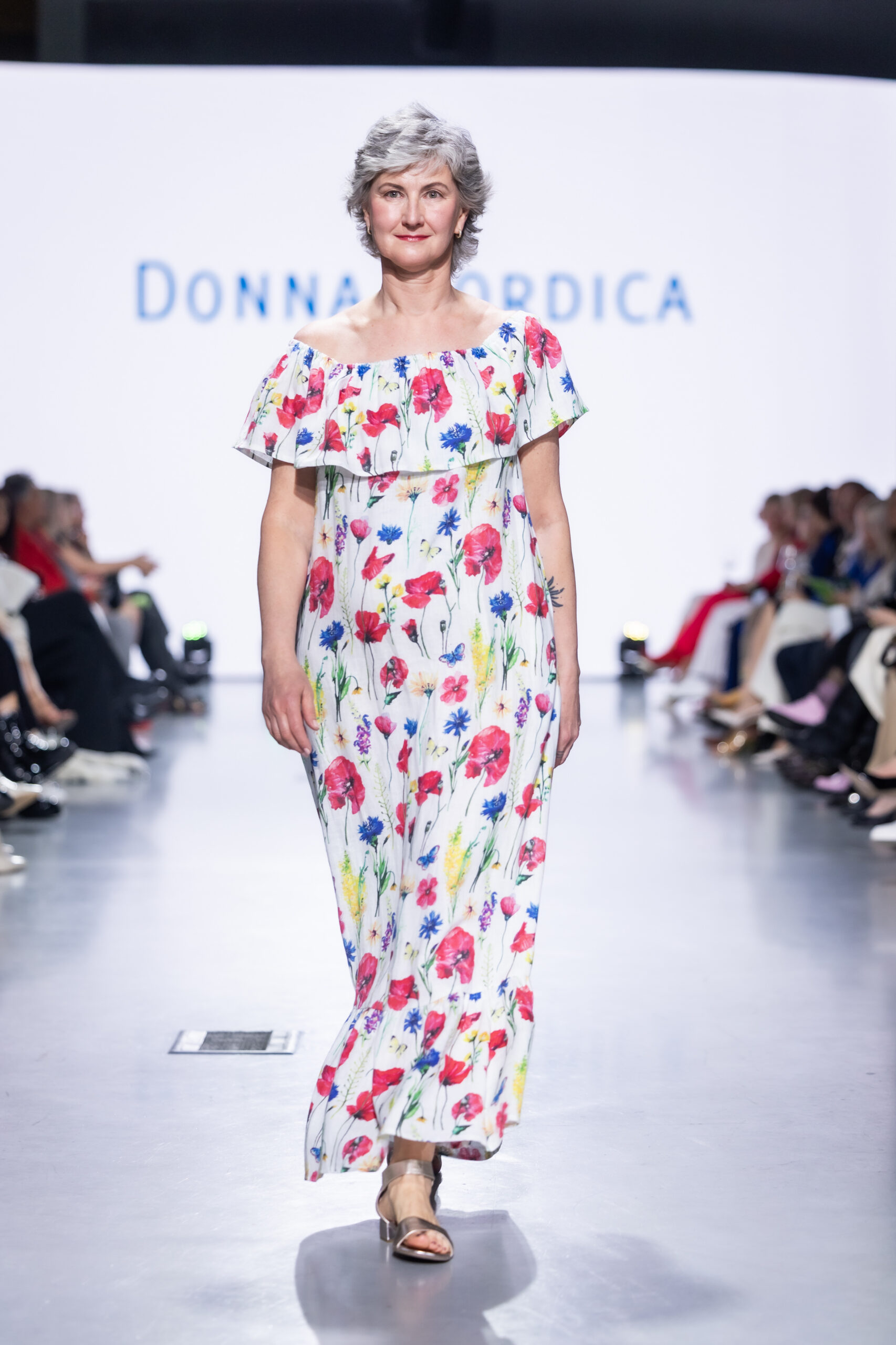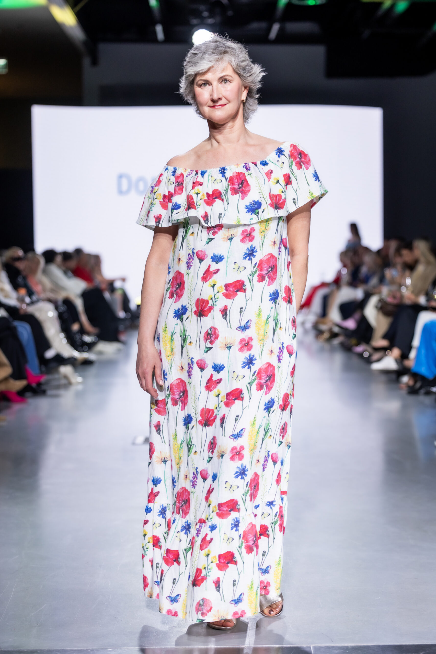 Klassikaline suvine maksipikkuses trapetskleit on ilma varrukateta, kuid õlalt maha lükatava volangiga. Mudel on maksipikkuses trapets, mil seelikusabas volang. Kleidi seelikuosas on peidetud külgtaskud. Kleidi üldpikkus taga kaelusevolangist alla on 131 cm (s. 40). Lisana seotav vöö, kuid kleiti saab kanda ka ilma vööta.