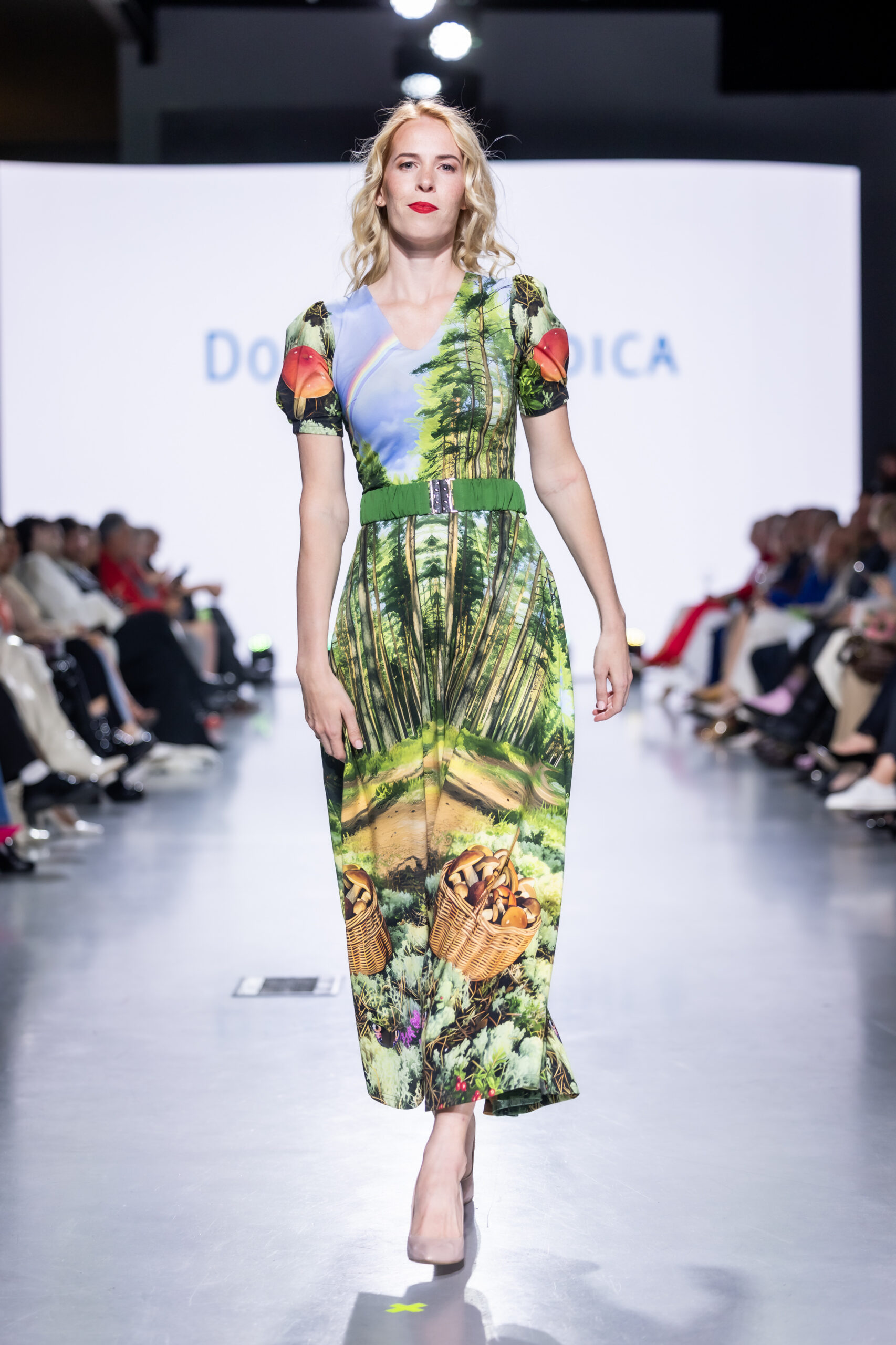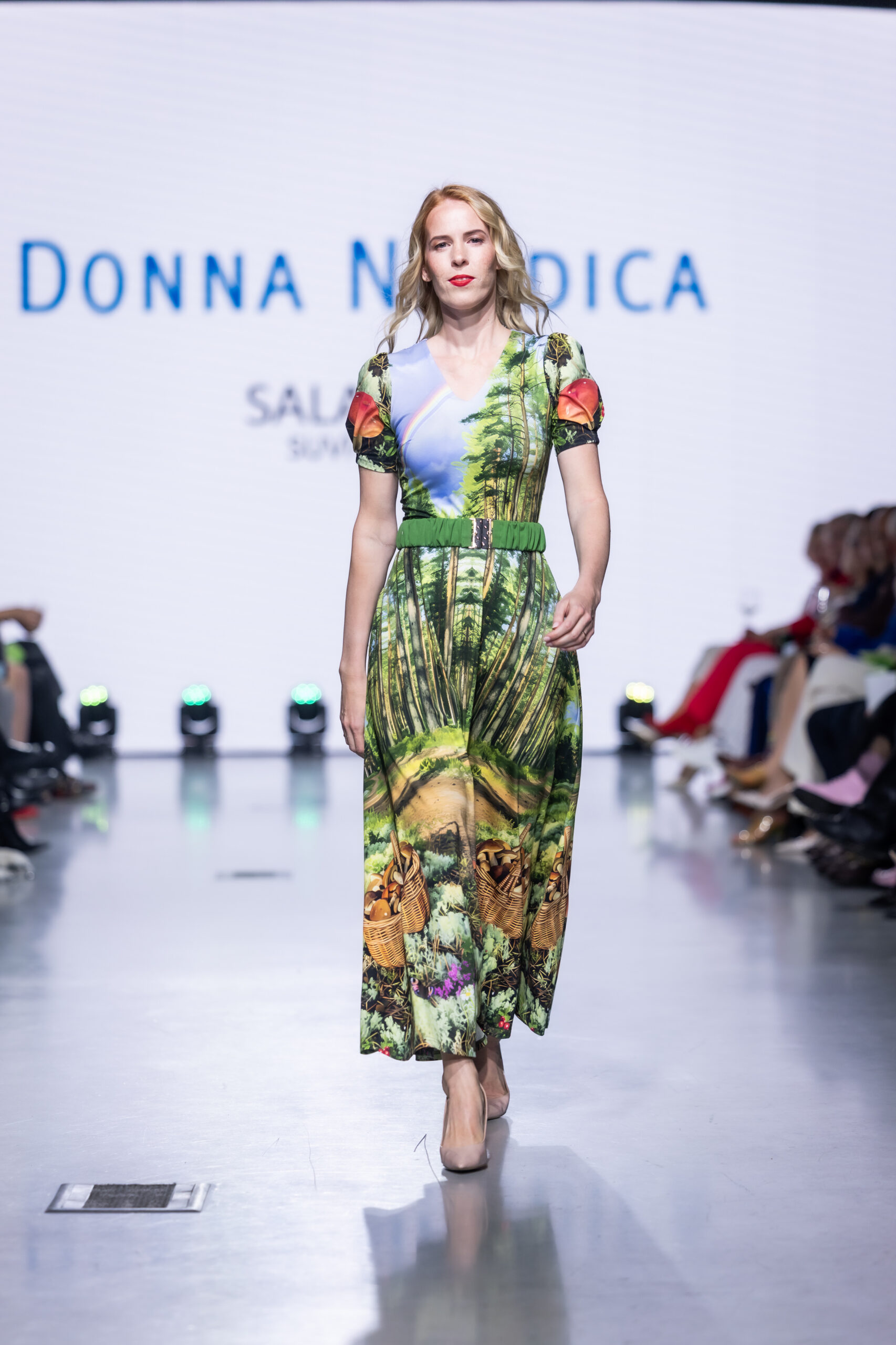 Uus signatuur paneelmuster kujutab stseeni Eesti männimetsast, kus metsatee lõpus on taevas vikerkaar ja raja kõrval seeni täis korjatud korv. See on pikk keskelt läbi lõigatud A-seelikuga kleit, mil seelikuosas külgtaskud. Kleidil on lühikesed õlalt krookega varrukad ja lauge O-kaelus. Soovi korral saab juurde seotava värvilise vöö, pandlaga vöö on lisatasu eest. Tellides saab muuta varruka disaini ja pikkust ja kaeluse kuju ning kleidi seeliku pikkust (see on näidisel s 38 nagu modellil seljas 100 cm). Nt võib tellida lühikeste puhvvarrukatega midikleidi vms. Materjal 95% puuvillane, ja 5% elastaan, pehme ja mõnus. Mustri paigutus võib erineda kleiditi, vastavalt suurusnumbrile ja tegumoele.