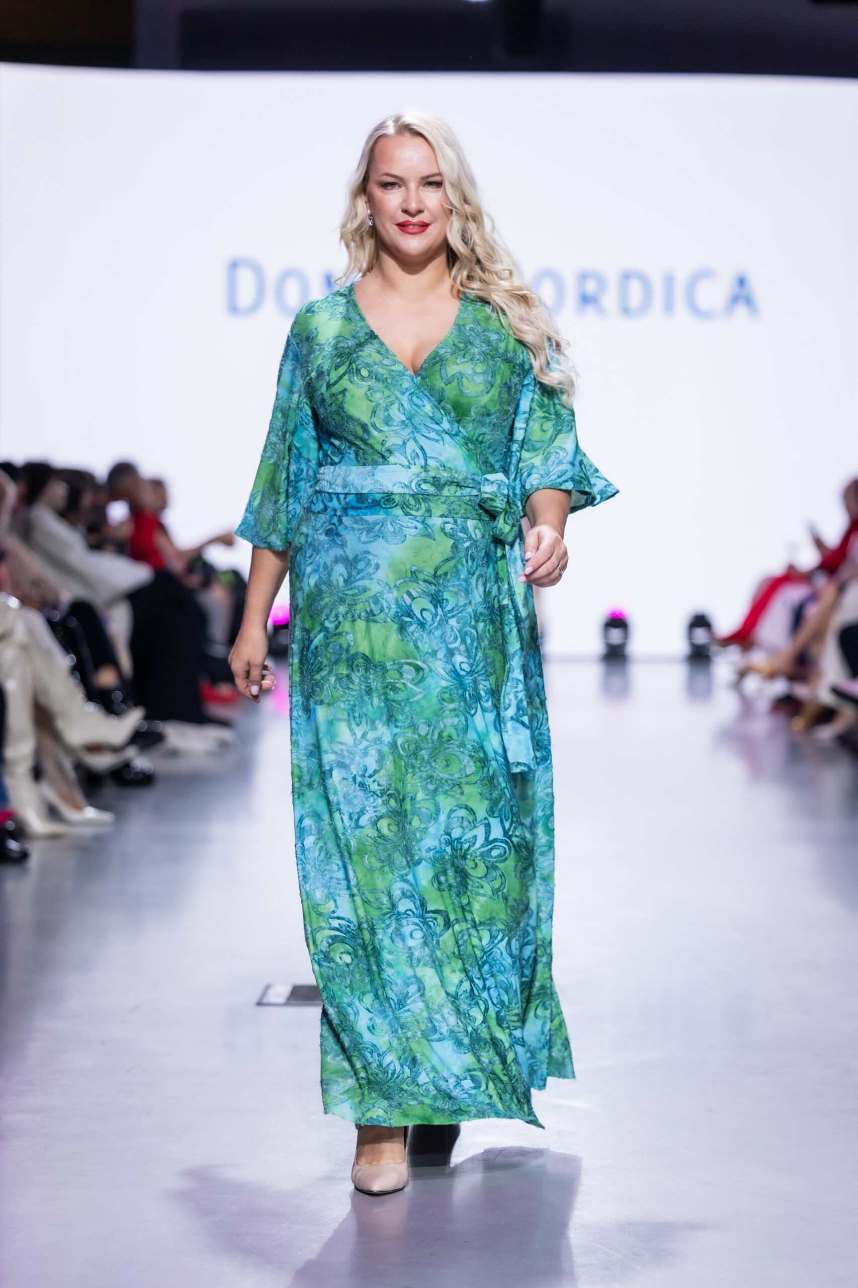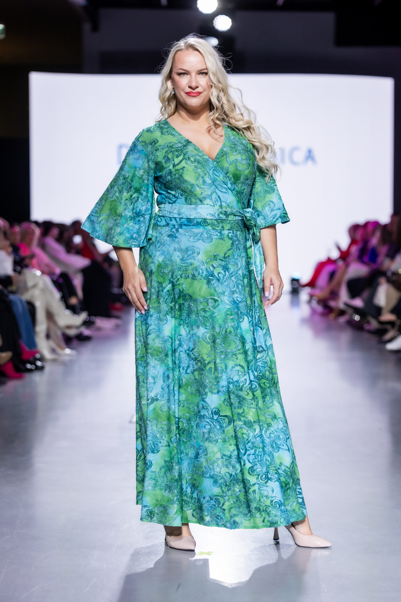See žakaarkoeline batiktehnikas värvitud viskoostrikotaaž on väga erilise ja meeldejääva koega kangas. Eri tooni roheliste-siniste veidi 3D pinnaga karvaste lehtede vahel on õrnalt läbikumav heledam kangapind, mis teeb kanga pidulikuks. Hooldusjuhend on kleidi küljeõmbluses. Koostis: 58% polüester, 38% viskoos ja 4% elastaan.