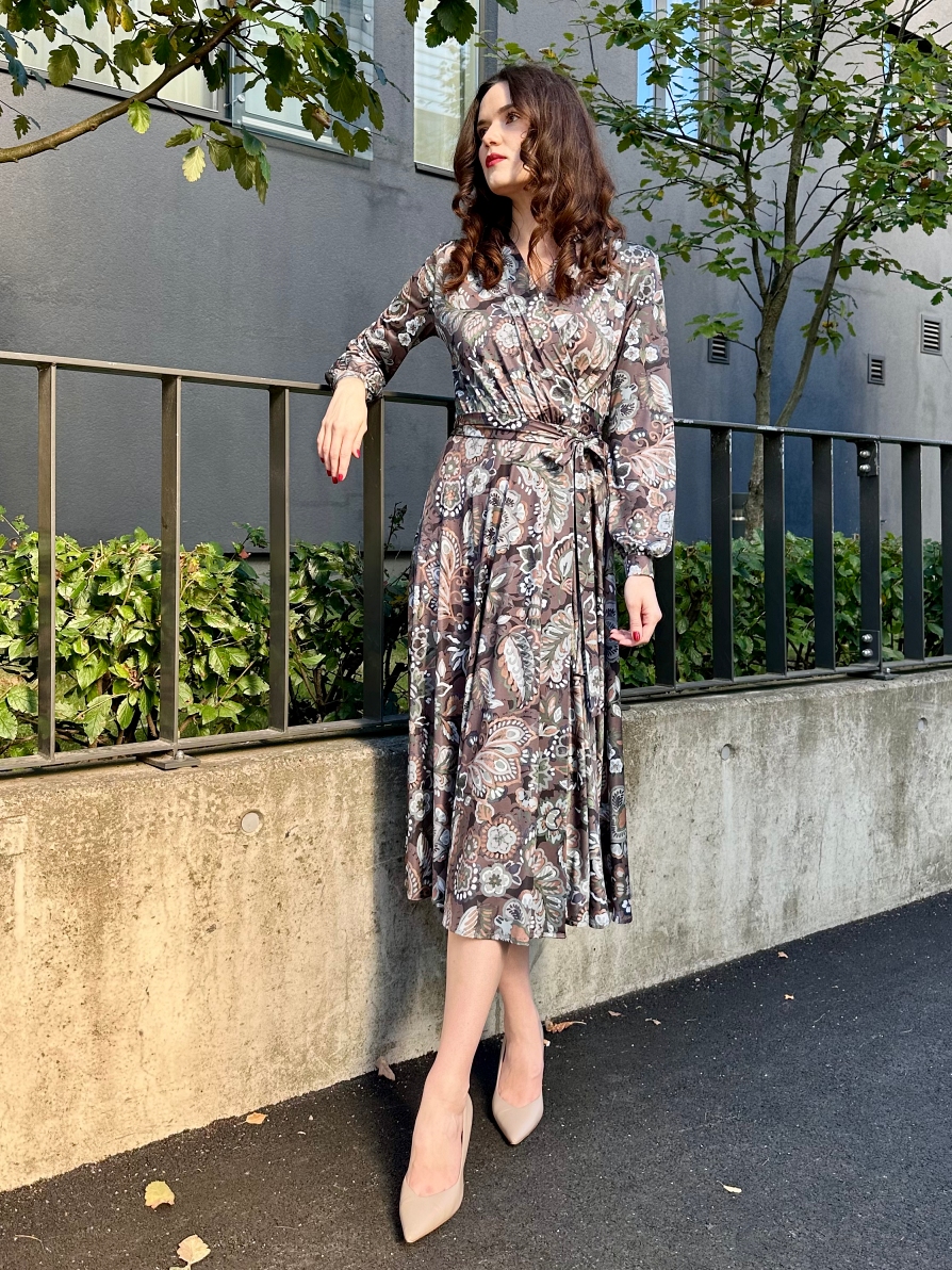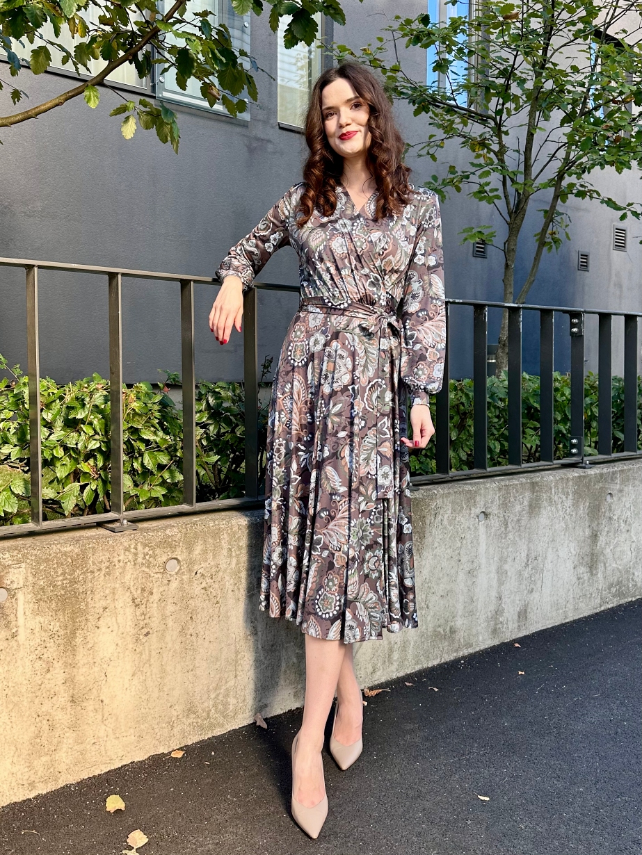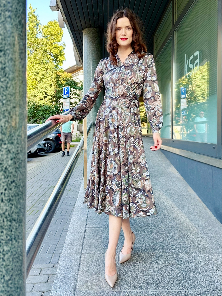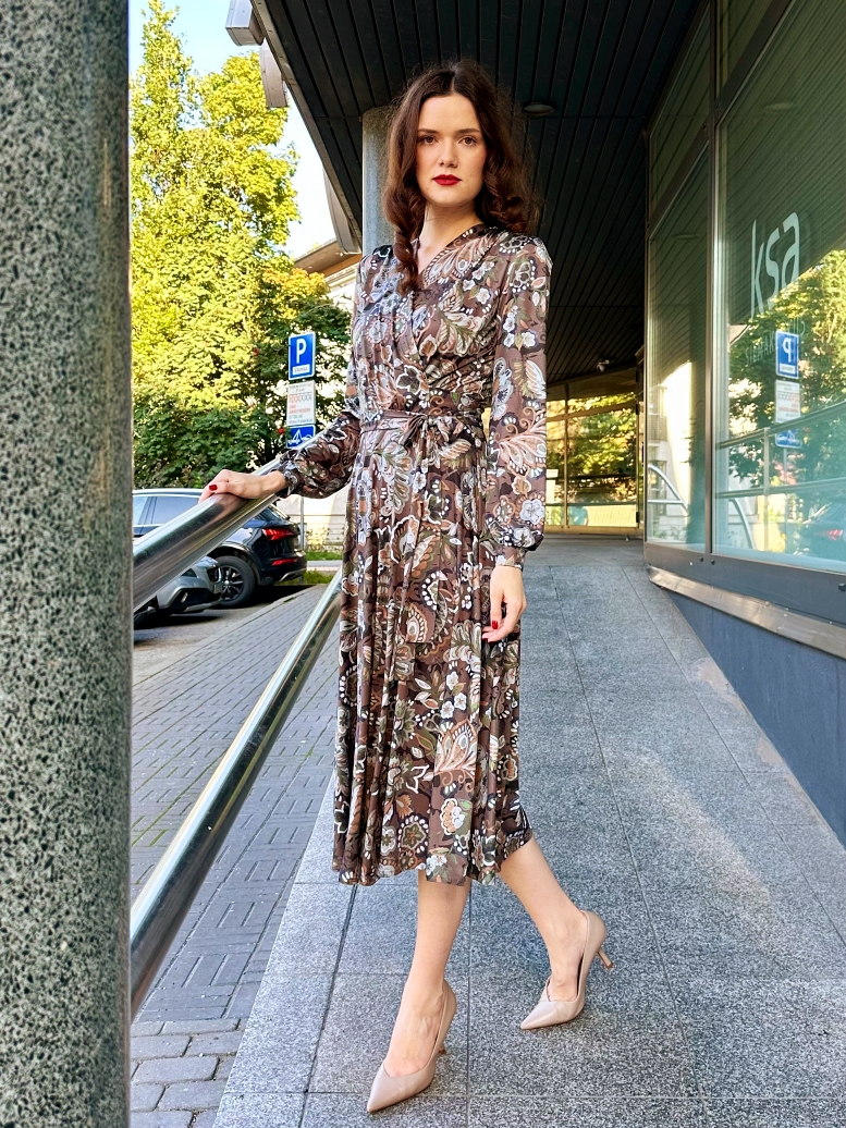Hallikates ja beežides toonides dekoorstiilis lehe- ja lillemustriga uus midipikkuses hõlmikkleit on lõikelt klassikaline, pikkade mansetile kroogitud varrukaga. Kleit sobib nii puhkuse-, töö- kui ka pidusündmusesse. See on hea reisikleit, mittekortsuv ning ajatu mustriga. Materjal on 96% polüester ning 4% elastaan, kangas on siidine, pehme, hingav ja mittekortsuv trikotaaž. Mannil seljas suurus 40.