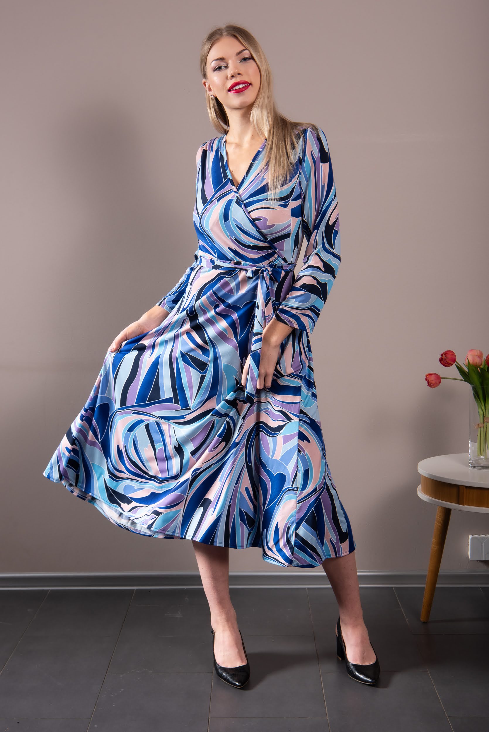Uus helesinine kevadine abstraktne dekoormuster! Mustris on sinakad ja roosakad roonid abstraktselt voogamas. See on pikem midi poolhõlmikkleit, mil ülaosa on veidi tõstetud keskkohaga hõlmik, kuid seelik on kinnine. Kleidil on külgedesse õmmeldud kaks vööotsa, varrukad õlalt krookega. Materjal on 96% polüester ning 4% elastaan, pehme, hingav ja mittekortsuv trikotaaž. Üks suurus, mis sobib suurusele 36-42 (modell on suurus 36 ja 176 cm pikk).