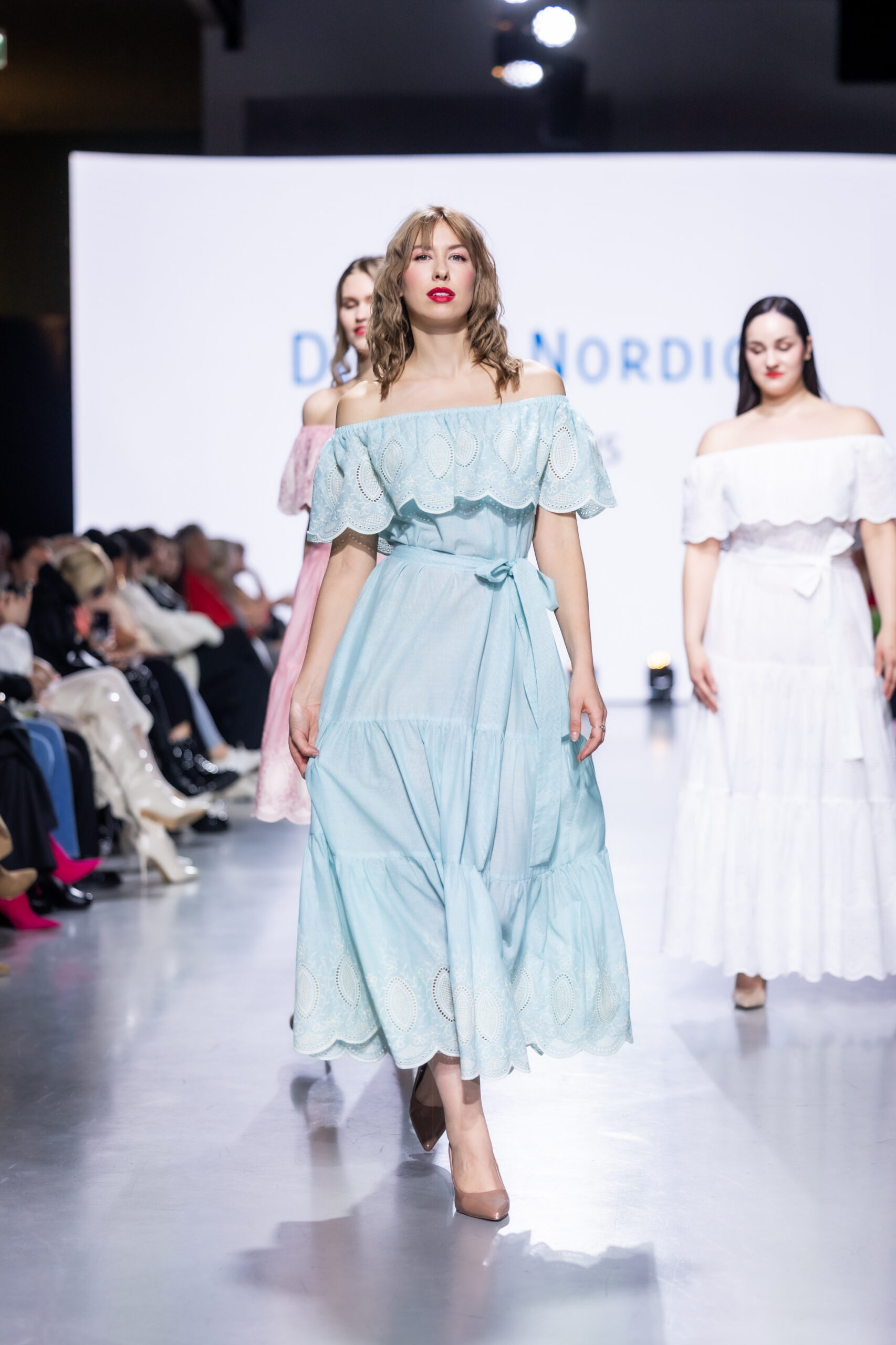 Kangas on ÖKOTEX sertifikaadiga 100% õhem ja õhku läbi laskev kerge ja pehme läbipestud puuvillane kahevärvilisest lõimest triipu kootud žakaarbatist broderiitehnikas tikitud pitsist portega. Hooldusjuhend on kleidi seelikuosa küljeõmbluses. Kleiti võib pesta jahedas vees.