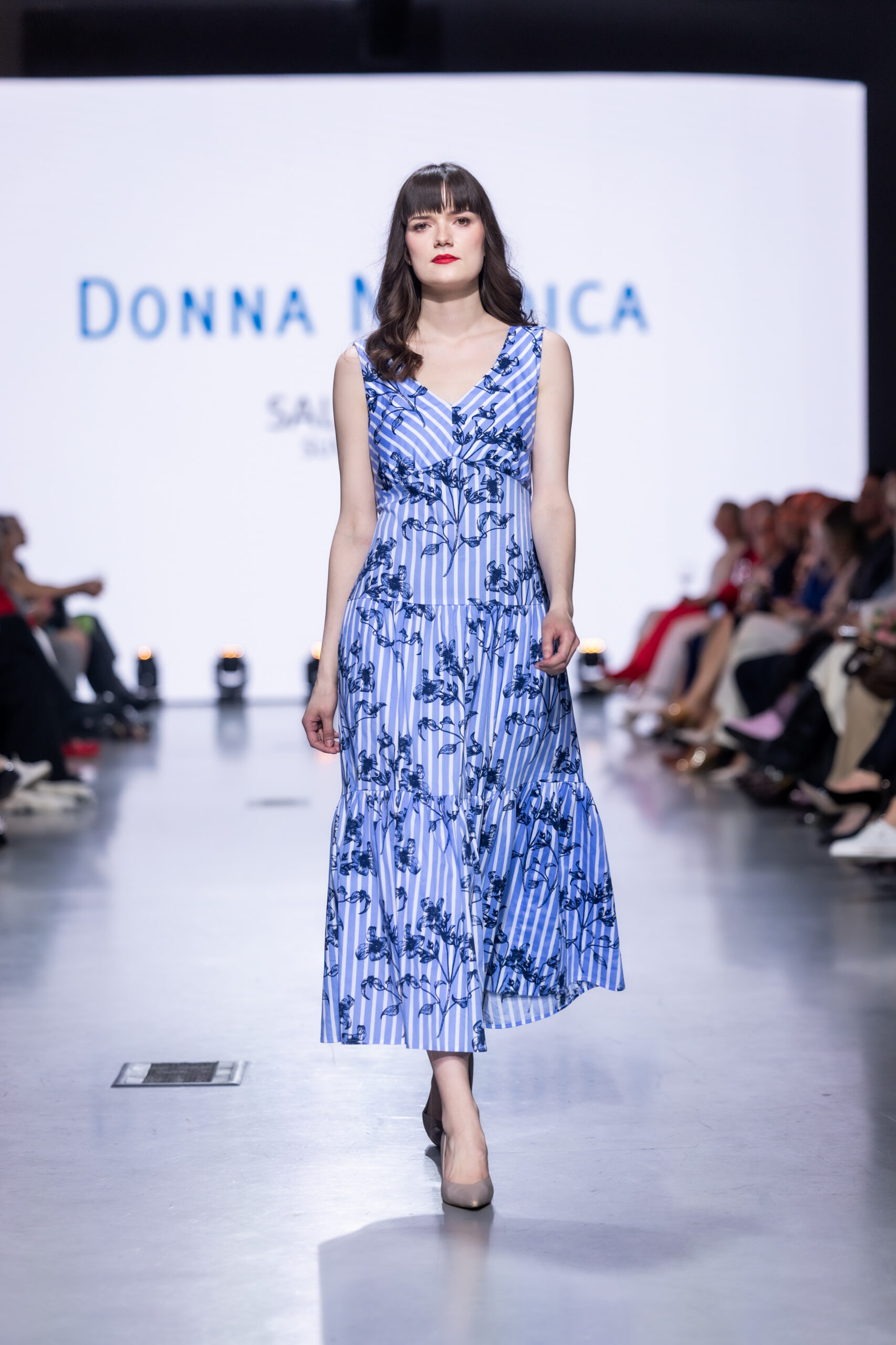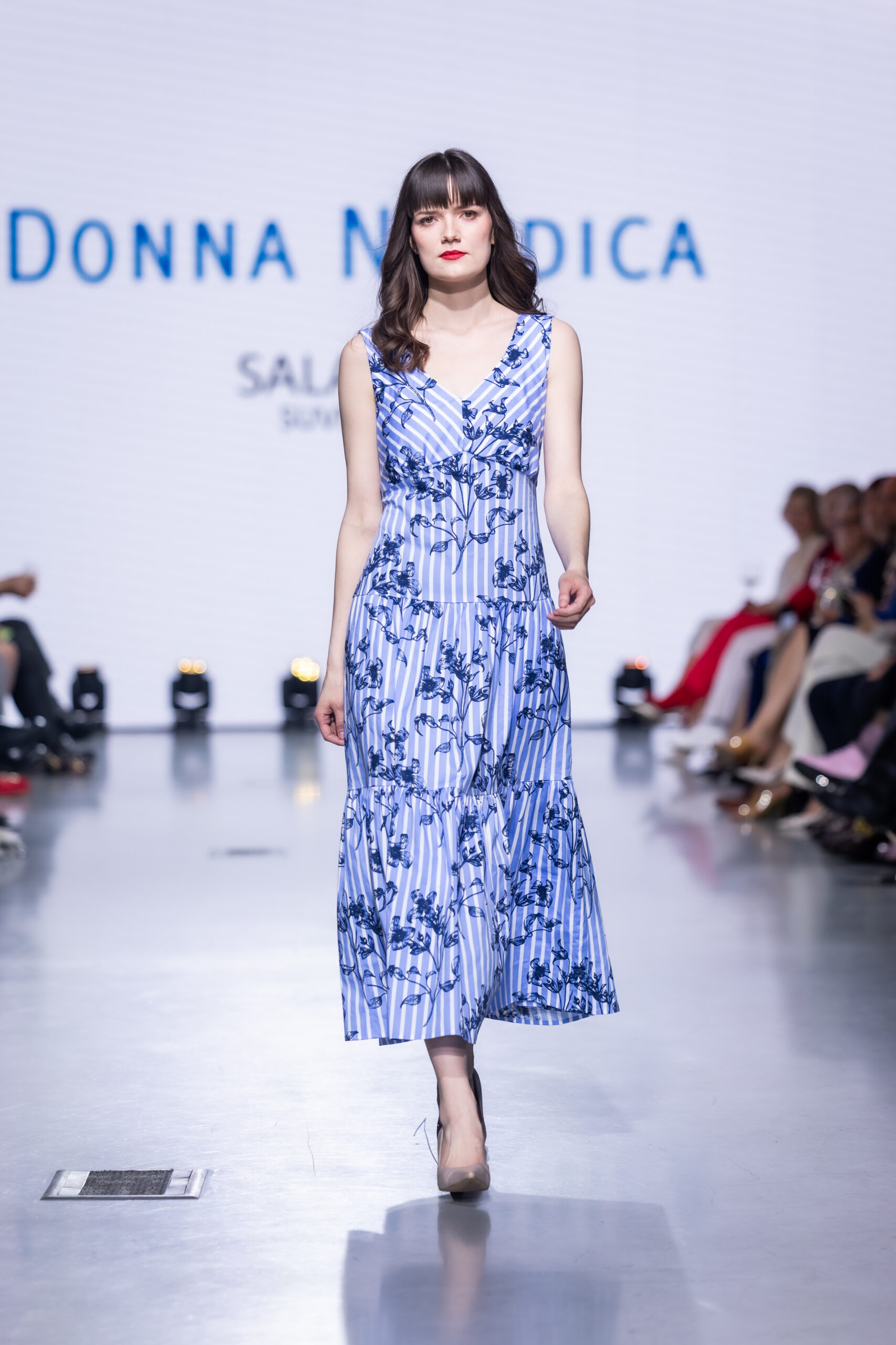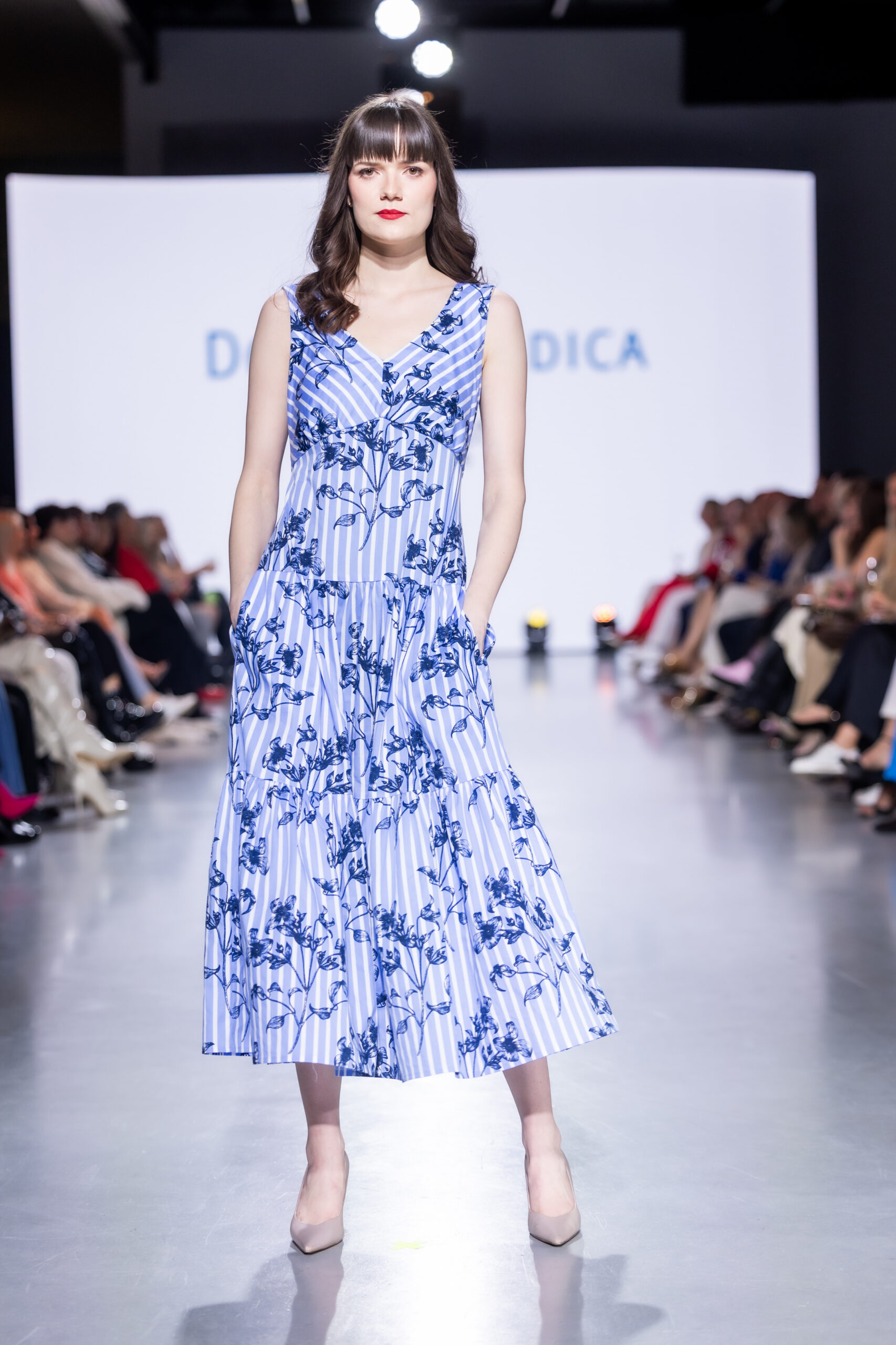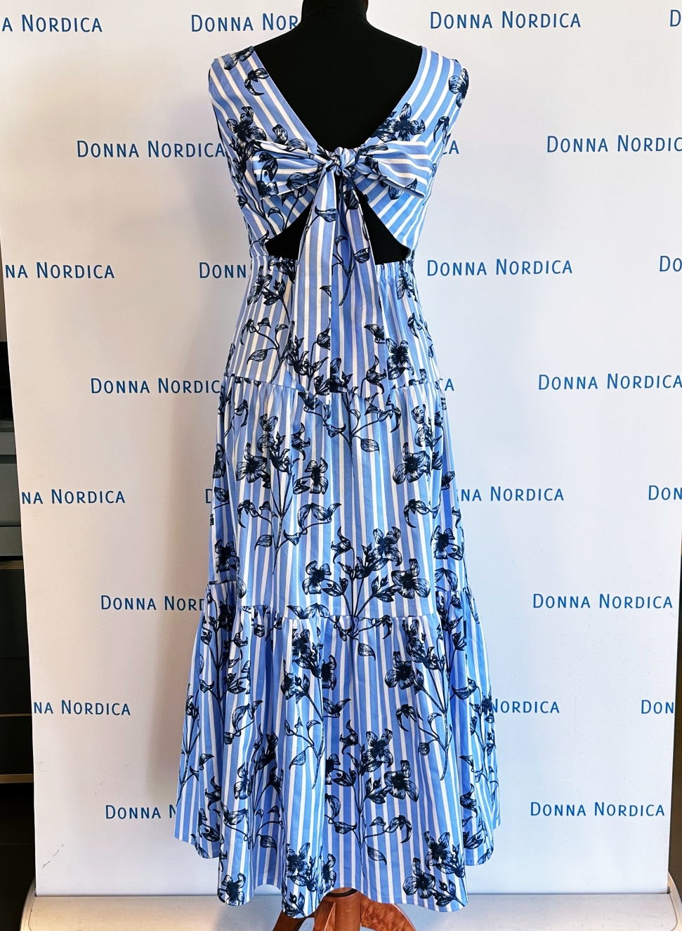 See helesiniste triipudega ning tumesiniste lilledega popliinkangas on 97% puuvill ja 3% spandex. Kangas on tihe, naturaalne, vähekortsuv. Toodet võib petsa jahedas vees ning triikida jaheda rauaga. Mitte panna kuivatusmasinasse. Hooldusjuhend on kleidi siseõmbluses.